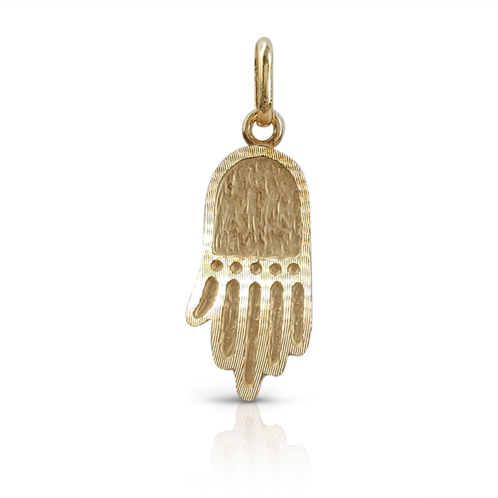 Hamsa pendant with an artistic brushed finish, made of 14 karat yellow gold, weighing 1.11 grams. A model designed according to the conservative line that was revealed as a Jewish symbol in archeological excavations, combined with a symbol that according to tradition is linked to the marking made in Egypt on the doors of the children of Israel to protect them when Pharaoh was beaten. Characteristic of the Jewish culture as an amulet seeking protection from God.