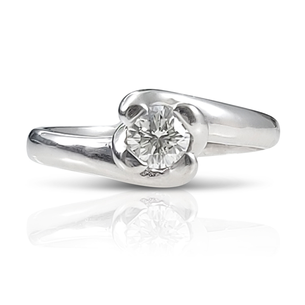 A conservative style of a solitaire engagement ring that presents the diamond in a sunken setting.