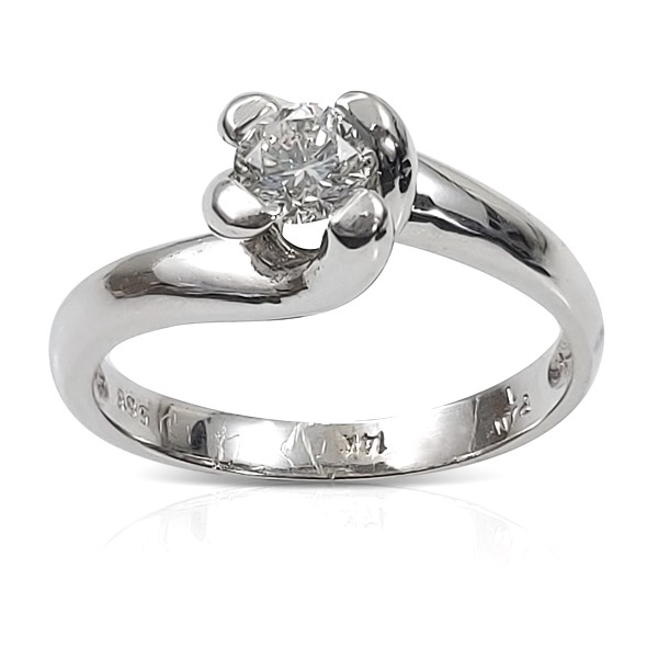 A conservative style of a solitaire engagement ring that presents the diamond with prongs setting.