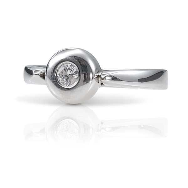 An innovative style of a solitaire engagement ring that presents the diamond in a Bezel setting.
