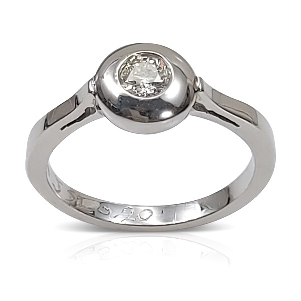 A conservative style of a solitaire engagement ring that presents the diamond in a sunken setting.