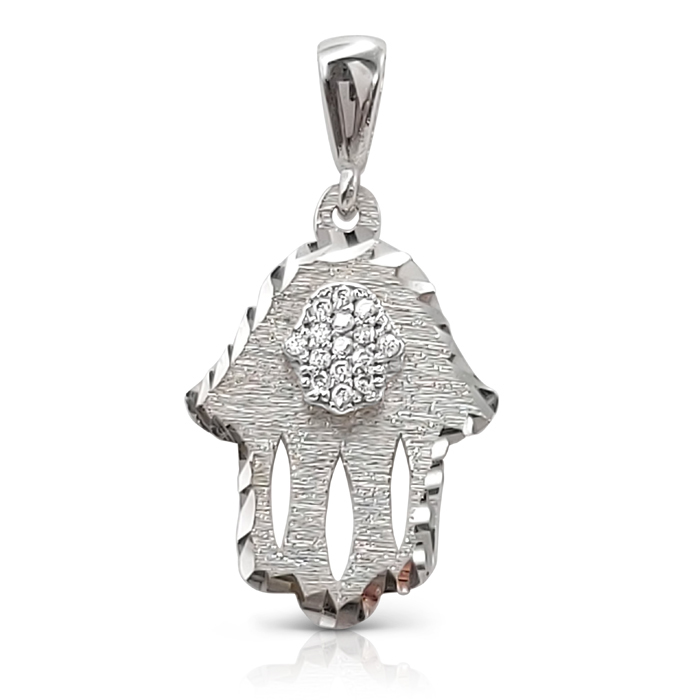 14k White gold pendant, weighing 2 gr, styled in the shape of an open palm Hamsa, inlaid along its entire length with natural zircon stones.In the Jewish tradition, the open palm symbol is used to create protection and ward off evil influences.