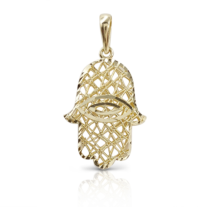 Hamsa pendant, made of 14 karat yellow gold, weighing 0.9 grams. An impressive model whose production is made possible thanks to construction in three-dimensional software. The inspiration for its design is according to the conservative line which was revealed as a Jewish symbol in archeological excavations, which incorporates a sign of an open eye that hints at divine providence on the wearer. The symbol is common among the communities of the Mediterranean Basin, and is characteristic of the Jewish culture of the East as an amulet seeking protection and providence from God.