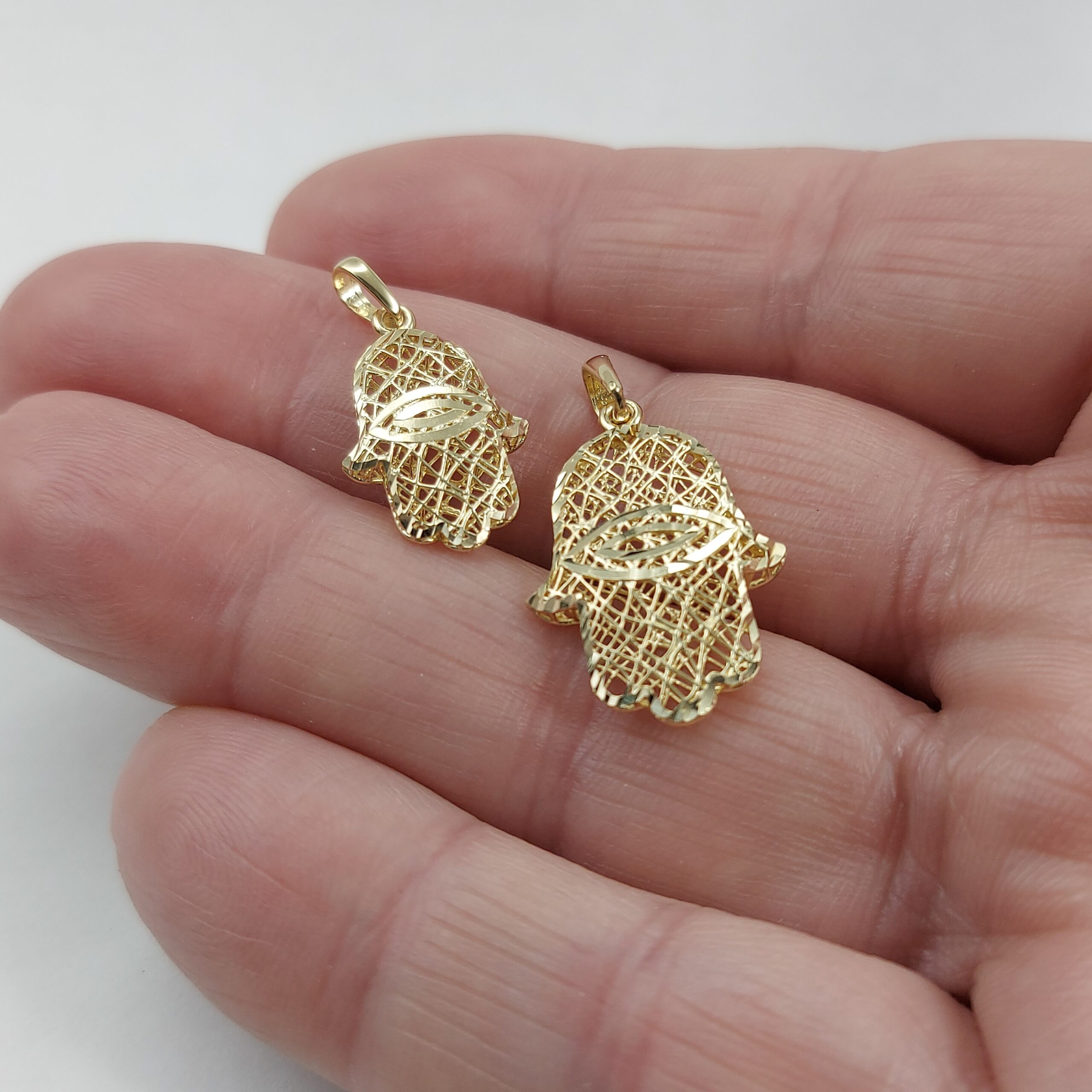 Hamsa pendant made of 14 karat yellow gold, weighing 1.5 grams.