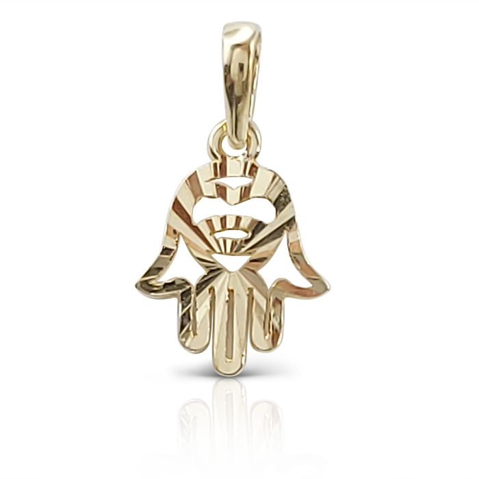 Hamsa pendant with a shiny engraved finish, made of 14 karat yellow gold, weighing 0.55 grams. The model, constructed using an interesting production technique, is built as a variation on Jewish symbols that have been unearthed in archeological excavations throughout the Middle East, but with the addition of a heart and a watchful open eye, which are symbols of divine providence over the wearer. Characteristic of Eastern culture as a mascot seeking protection.