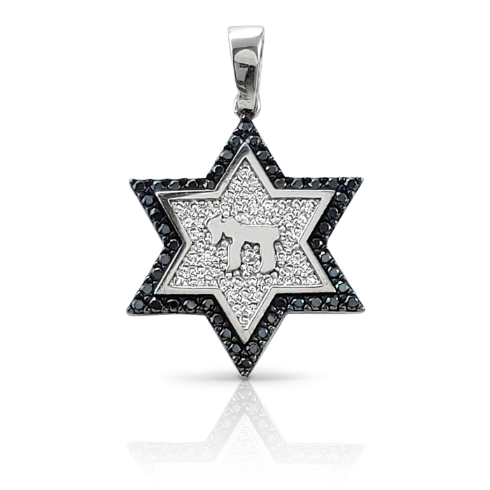 Our expertise is in designing jewelry suitable for fashion oriented Jewish clientele and in this item we chose to surround the “CHAI” symbol, in the center of the pendant, with black zircon stones for a glamour feminine look.