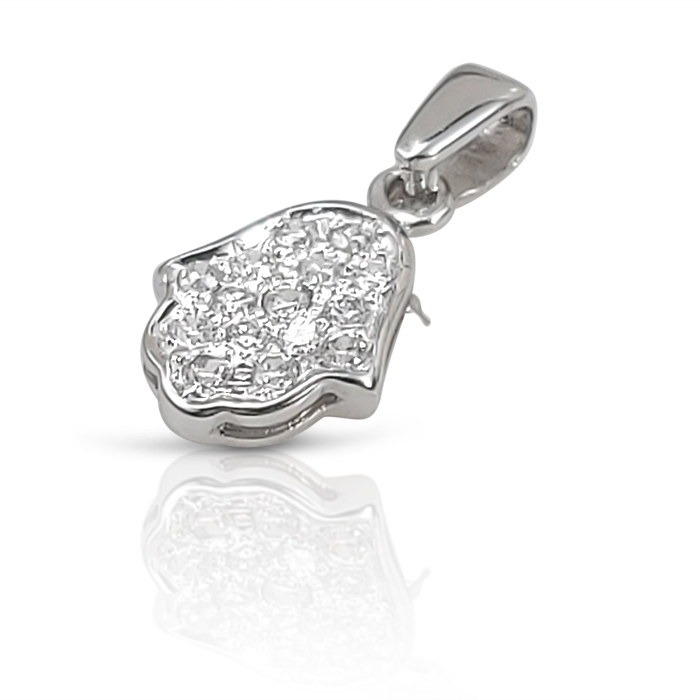 14k White gold pendant, weighing 1.0 g, designed in the shape of a Hamsa set along its entire length with natural zircon stones, around the “mother” print.
