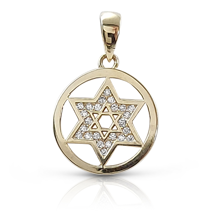 A pendant designed as a Star of David made of 14k gold that weighs 1.72 grams. This is a quiet and classic design of the Magen David encircled in a circle. The circle that surrounds the Jewish symbol comes to express the integrity of the faith of the wearer, a belief that is based on the presence of one God in the whole world of creation. The emblem of the Star of David itself is inlaid with natural zircon stones, to give the pendant a luxurious look. The pendant us a perfect Jewish gift, and can be ordered set with diamonds. It can also be ordered in any size preferred by the customer.